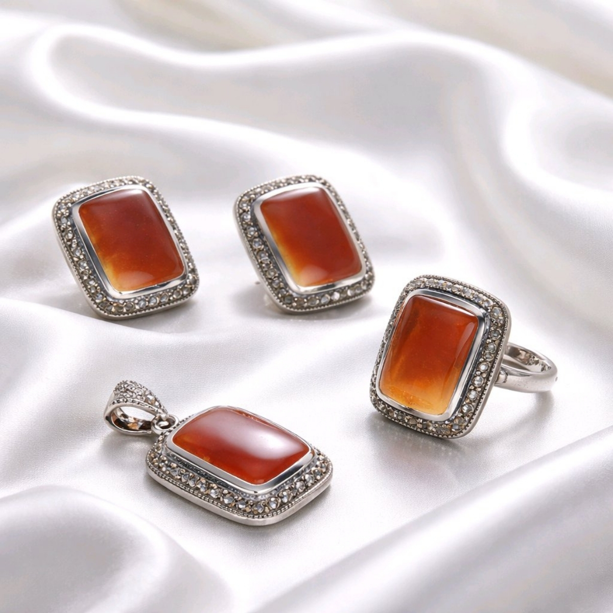 Akik taş ve markazit detaylarıyla tasarlanmış, doğal ve vintage şıklığı bir araya getiren özel takı seti.