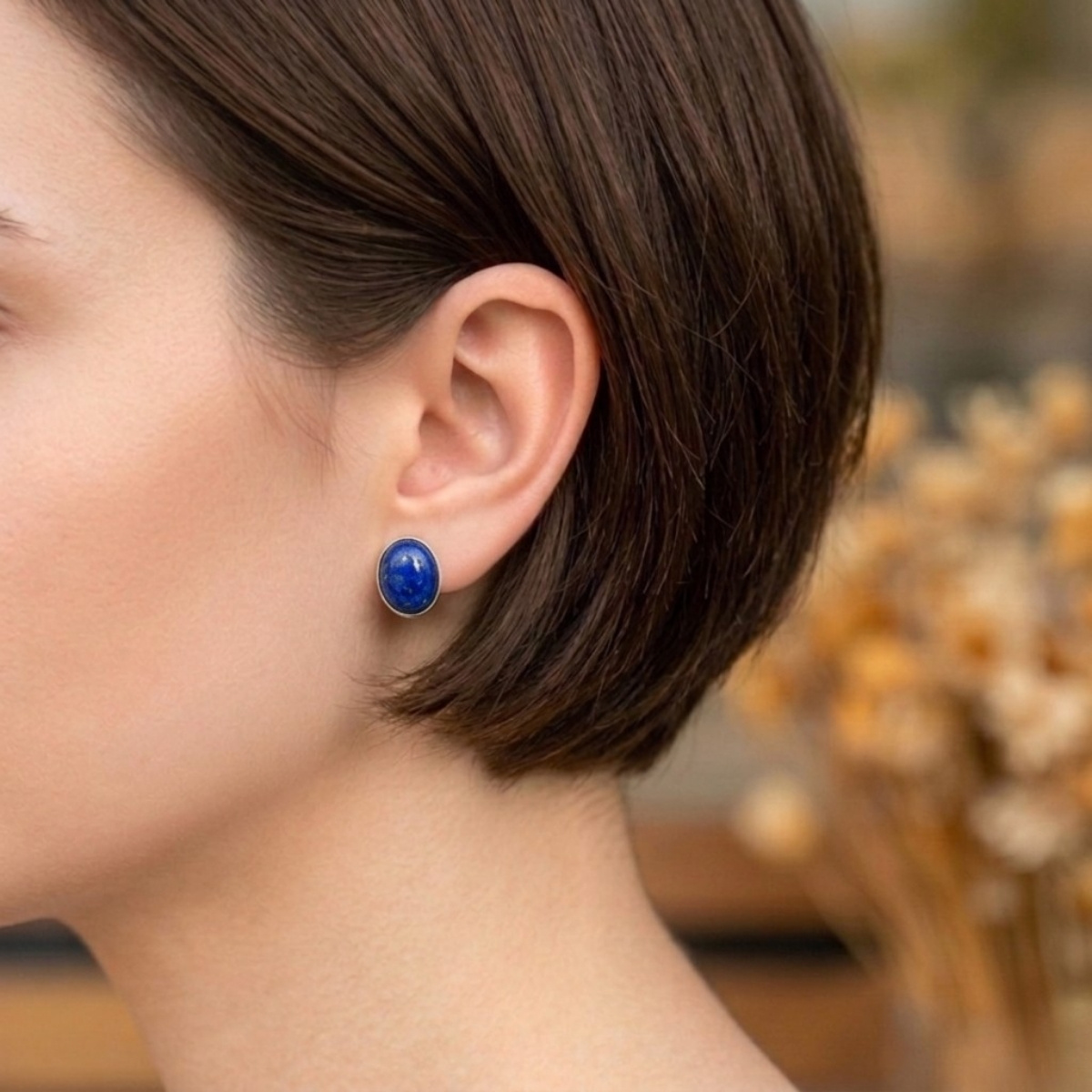 Lapis lazuli taşın derin mavi tonlarıyla tasarlanmış zarif ve dikkat çekici küpe.