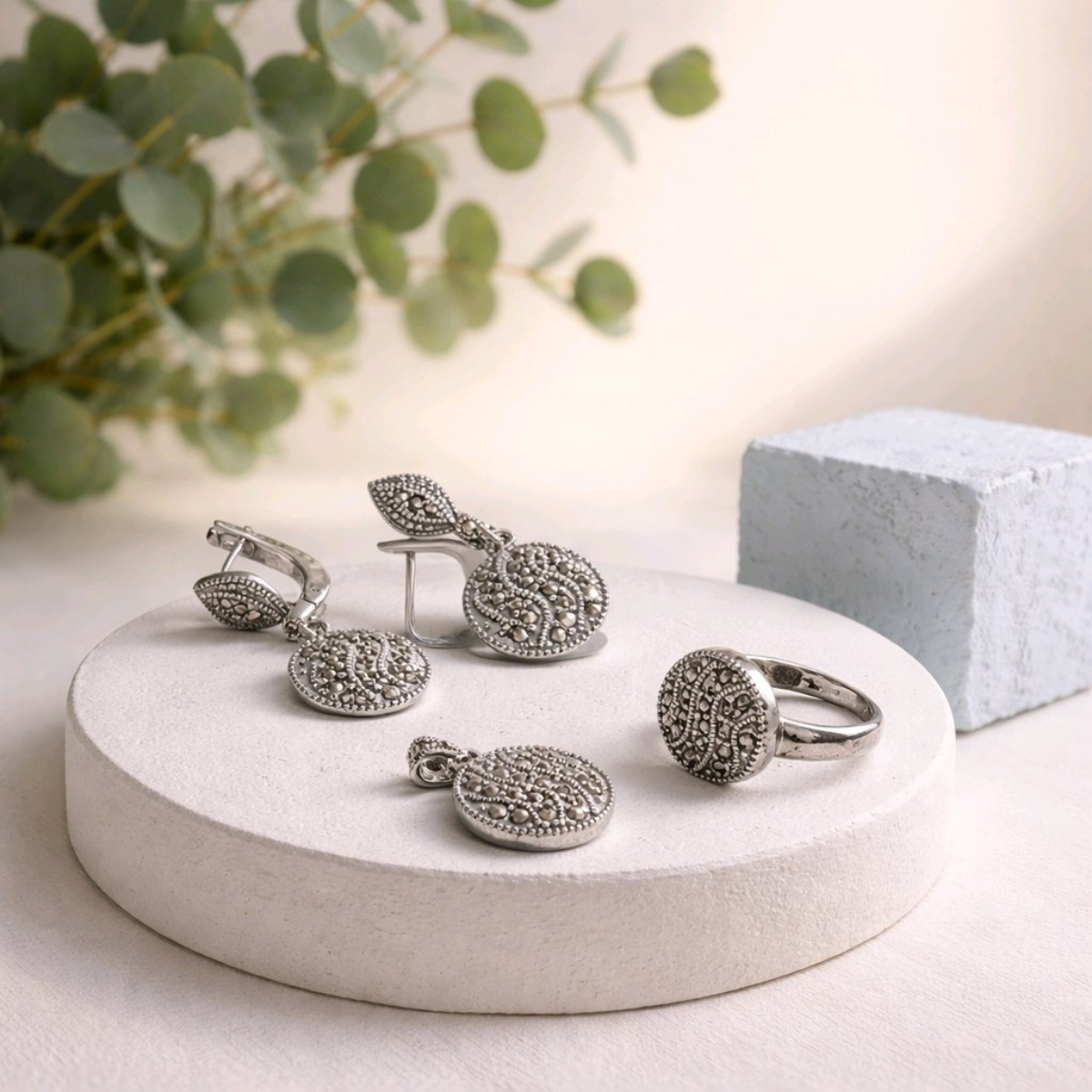 Markazit taşların vintage ışıltısıyla tasarlanmış zarif ve klasik gümüş takı seti.