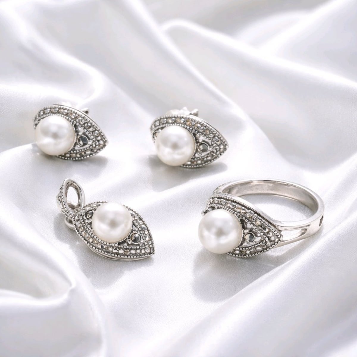 Mayorka inci ve markazit detaylarıyla tasarlanmış klasik ve zarif takı seti.
