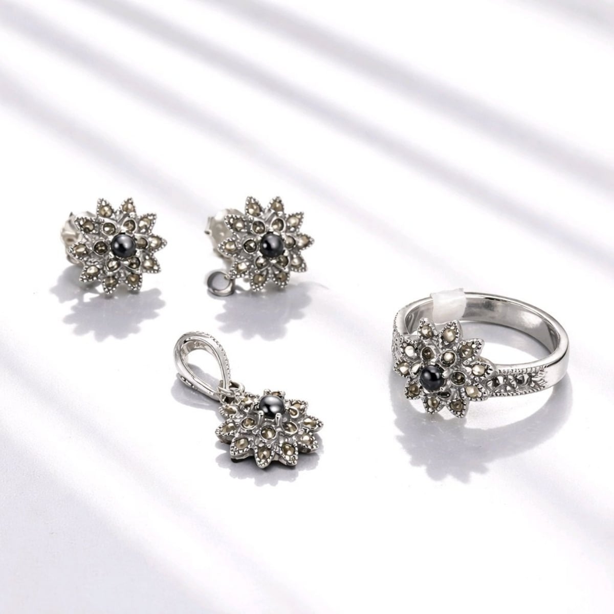 Onix taşı ve markazit detaylarıyla tasarlanmış, güçlü ve vintage şıklık sunan özel takı seti.