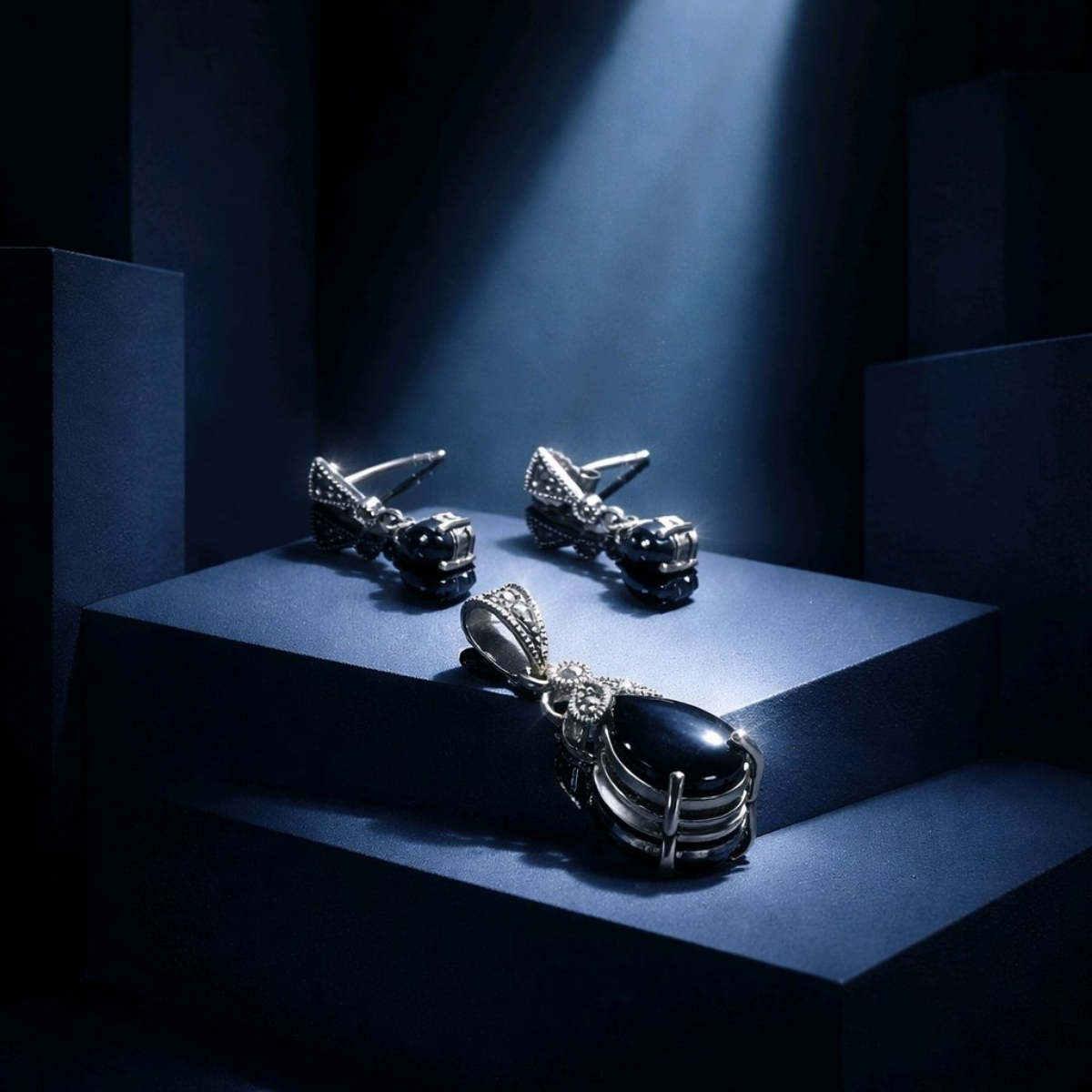 Onix taşının sade ama etkileyici duruşu, markazit taşlarının ince işçiliğiyle dengelenerek sofistike bir görünüm oluşturur. Bu özel tasarım takım, hem günlük kullanımda zarif bir tamamlayıcı hem de özel davetlerde dikkat çekici bir aksesuar olarak öne çıkar.